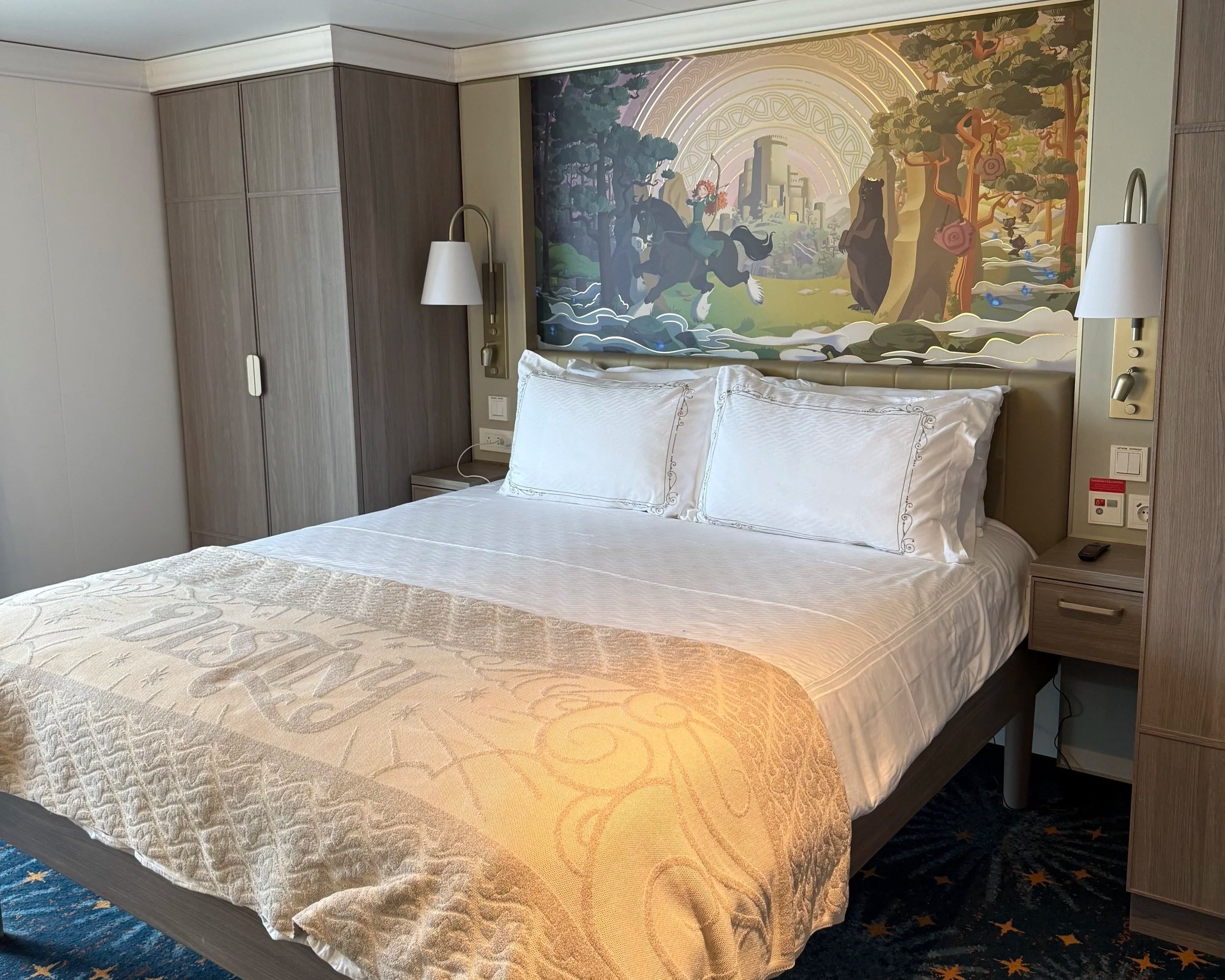 We stayed in an accessible Verandah stateroom on Deck 9, themed around Brave, and the first thing we noticed was how carefully that theming had been handled. Celtic patterns, soft earth tones, artwork that references the film without overwhelming the space. It felt like an upscale cabin with just enough whimsy to remind you where you are. The same caveat applies here that applies on any cruise line: a stateroom is not a hotel room. The design is clever and the finish is above most ships in this category, but it does not approach what a luxury hotel room delivers at a comparable price.
