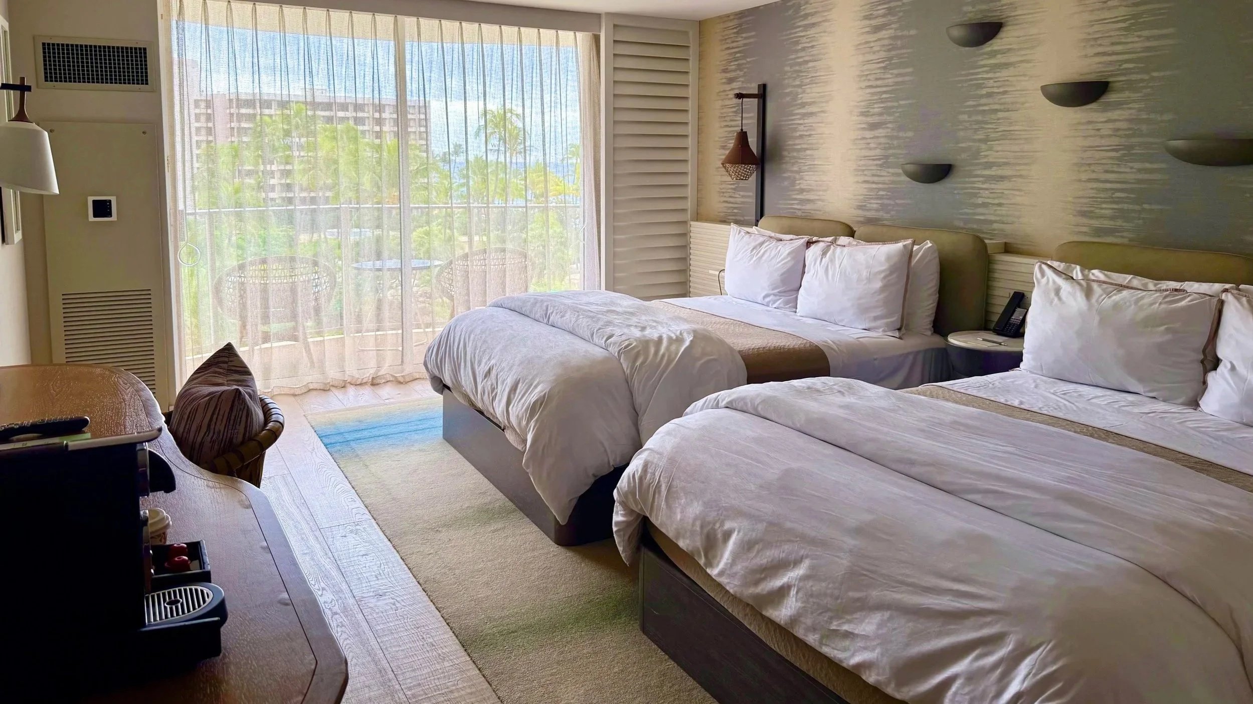 The room after the $160 million renovation: ocean through the windows and beds that were ready for us the moment we walked in.