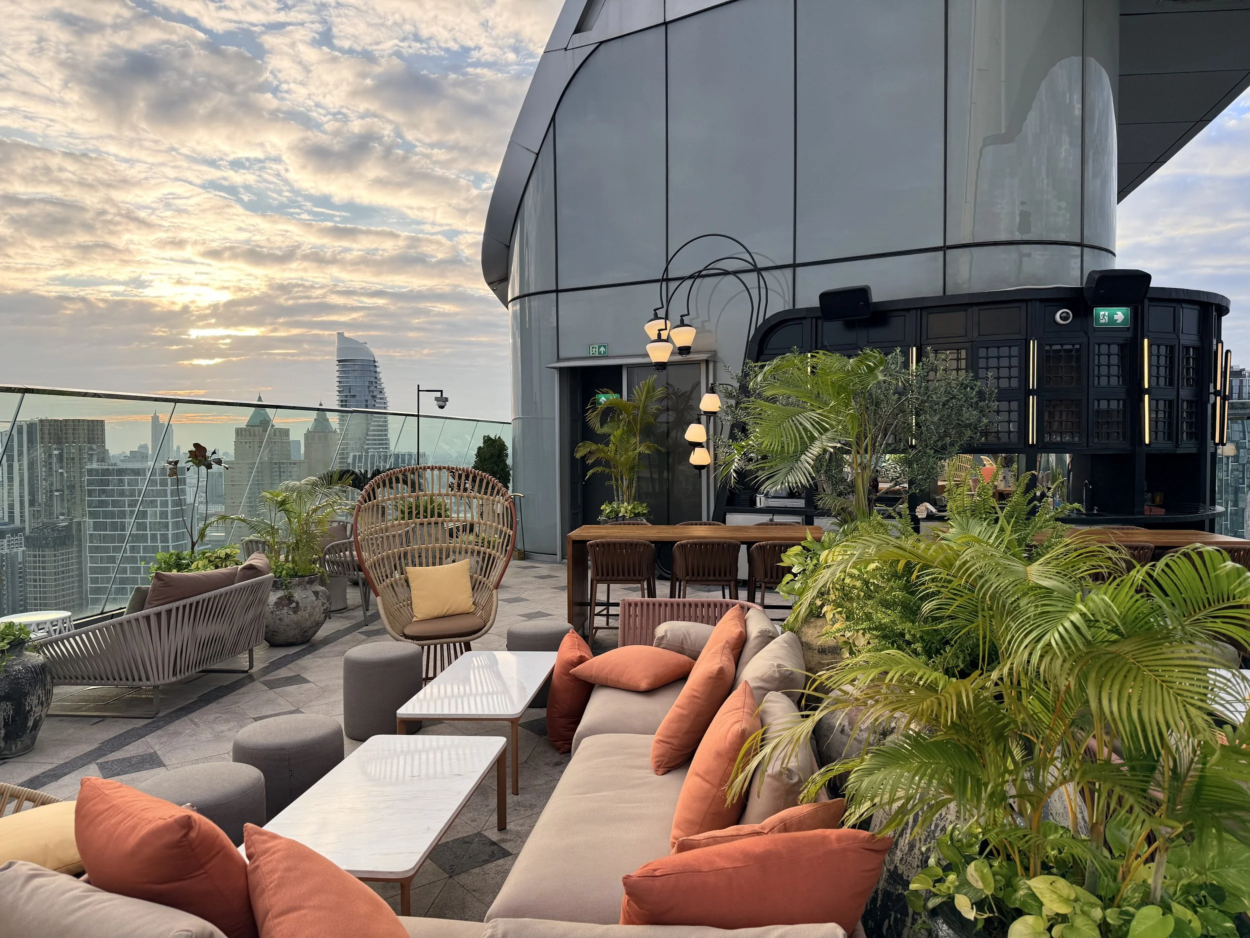 The rooftop terrace at sunset. Bangkok does dramatic skies, and this is the right place to watch them.